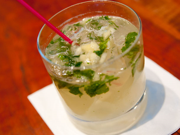 Muddle ginger and sugar in the bottom of a cocktail shaker. Add mint, ice, and white wine, shake well. Pour into rocks glass unstrained.